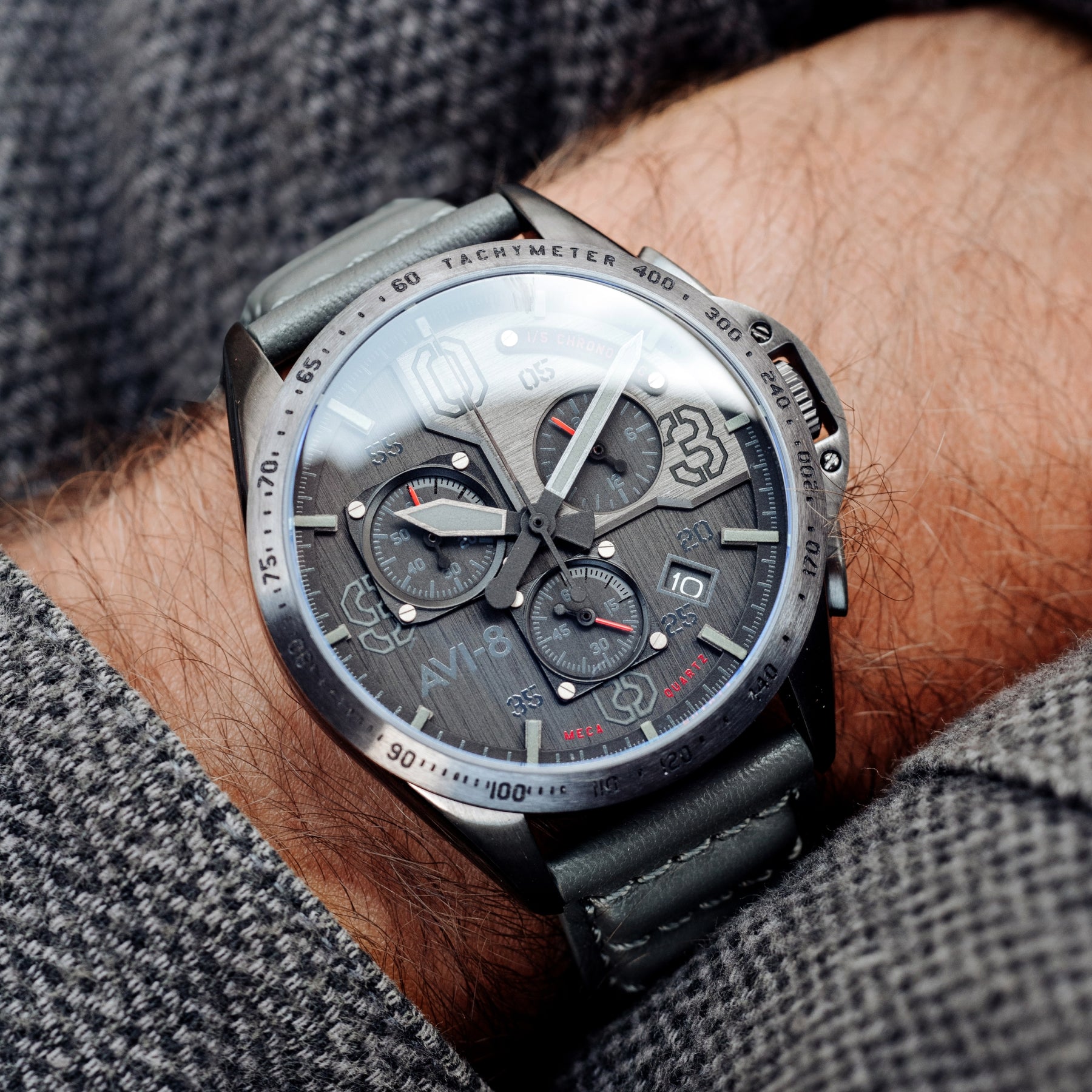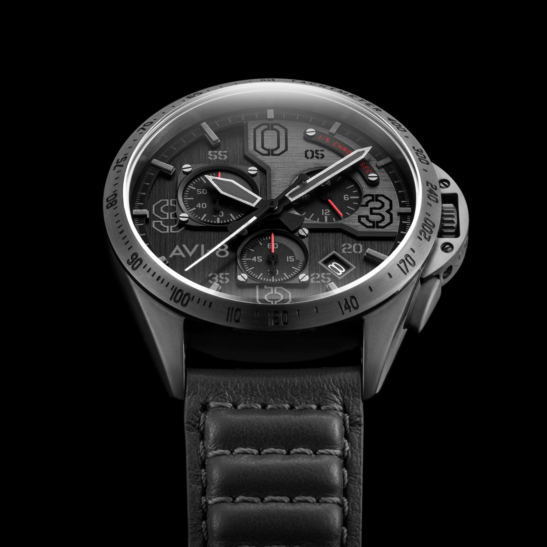 The dial of the Blakeslee Chronograph leans on both the inner and outer detailing of the P-51 Mustang. Carefully designed, the dial is a lesson in legibility and visually arresting layout.