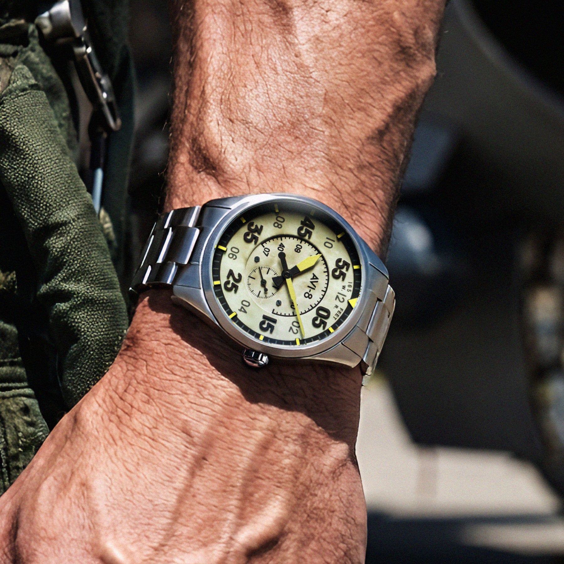 As one of AVI-8’s most popular pilot watches, the Type 300 Automatic returns with stronger materials, deeper visual contrast, and a more assertive wrist presence. The 42mm timepiece also features an exhibition caseback fitted with a bespoke rotor design.