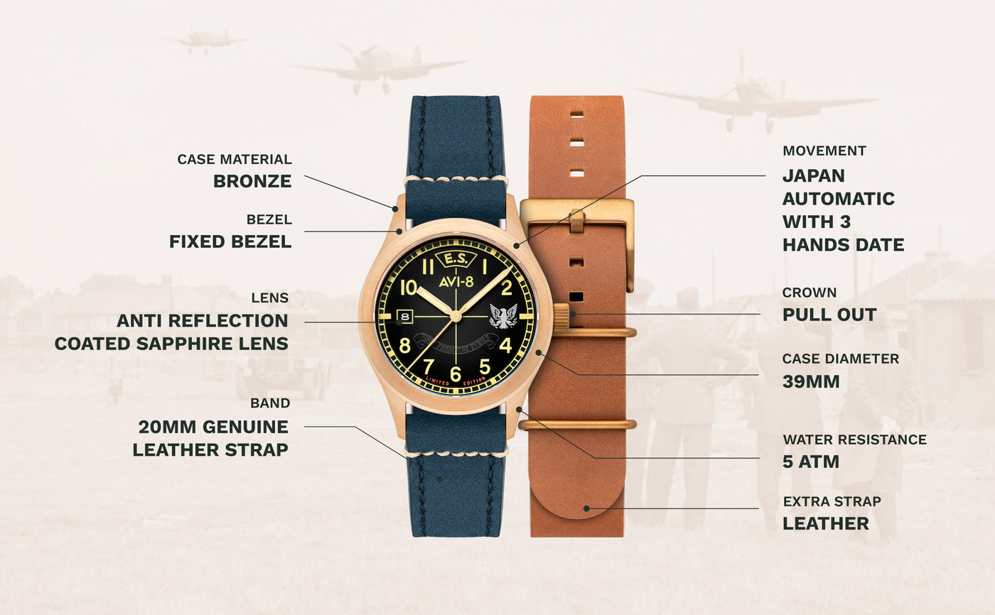 A bronze case that matures with time. A sapphire lens built for clarity and endurance. A reliable Japanese Miyota automatic movement delivers precision and durability for every mission. Two genuine leather straps — crazy horse and oil-finished — to complete a look that’s rugged yet refined. Every detail evokes the bravery and resilience of wartime aviation.