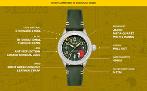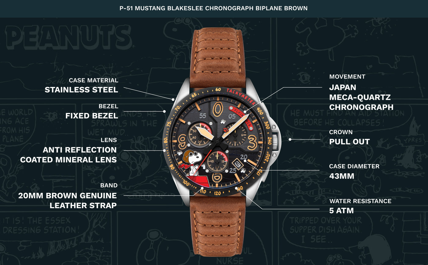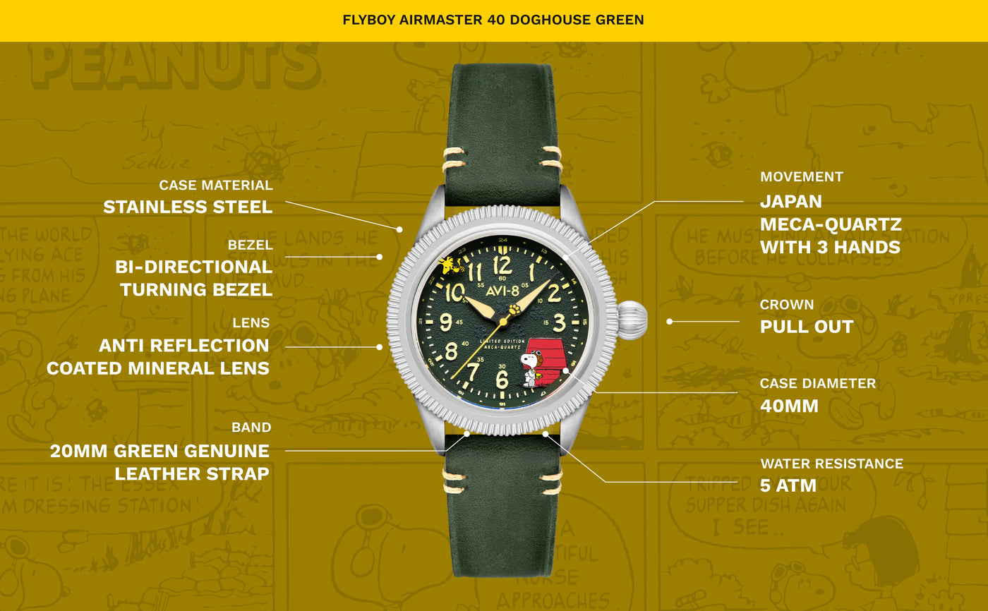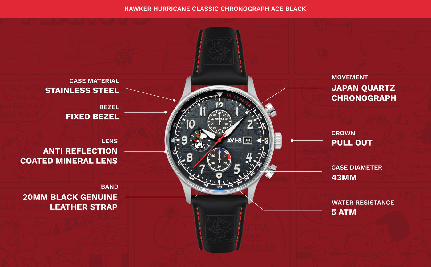 Each timepiece takes off from a different AVI-8 signature series—Flyboy Airmaster, Hawker Hurricane, Hawker Harrier, Hawker Hunter, and P-51 Mustang—crafted to reflect Snoopy’s aerial adventures and individual character in every detail.
