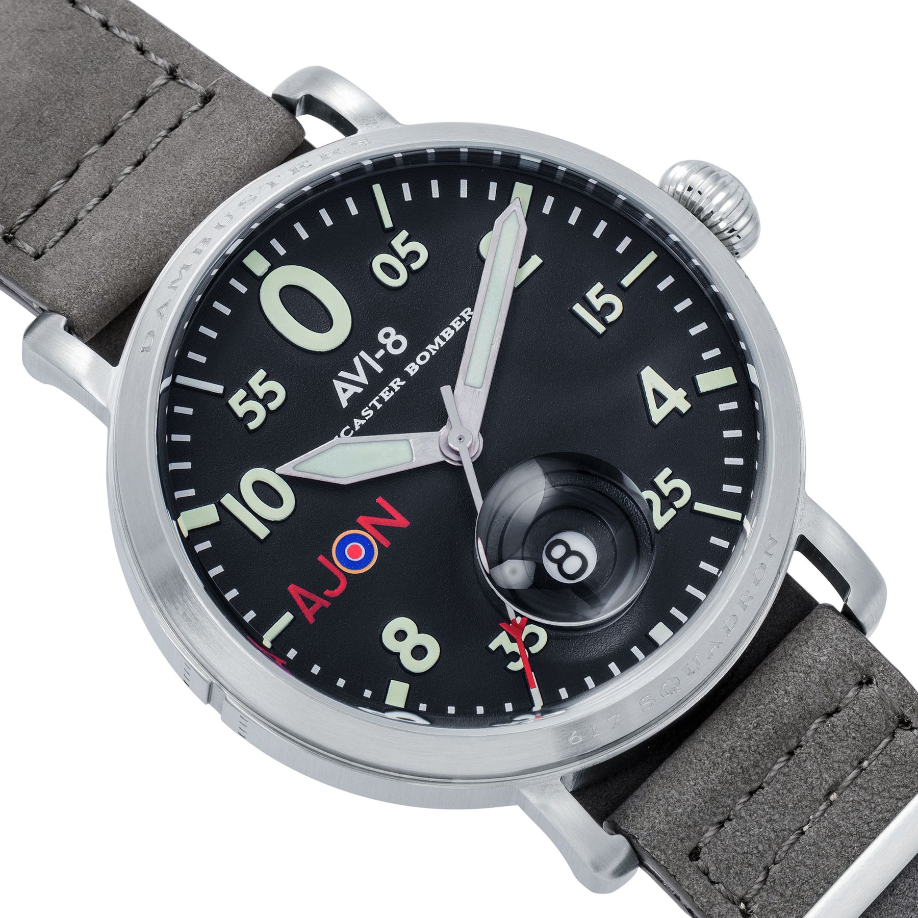 This timepiece features a large open case design that offers a clear vintage pilot watch shape replete with bold Arabic numbers on the dial, and gauge-like hands that hint at cockpit displays of the Lancaster. Subtle details such as the squadron reference on the left side of the dial, and the bubble-like date magnifier–sitting at the 6 o’clock position to reference the clear gun turrets on the Lancaster that served as essential defence mechanisms during their strategic bombing missions.
