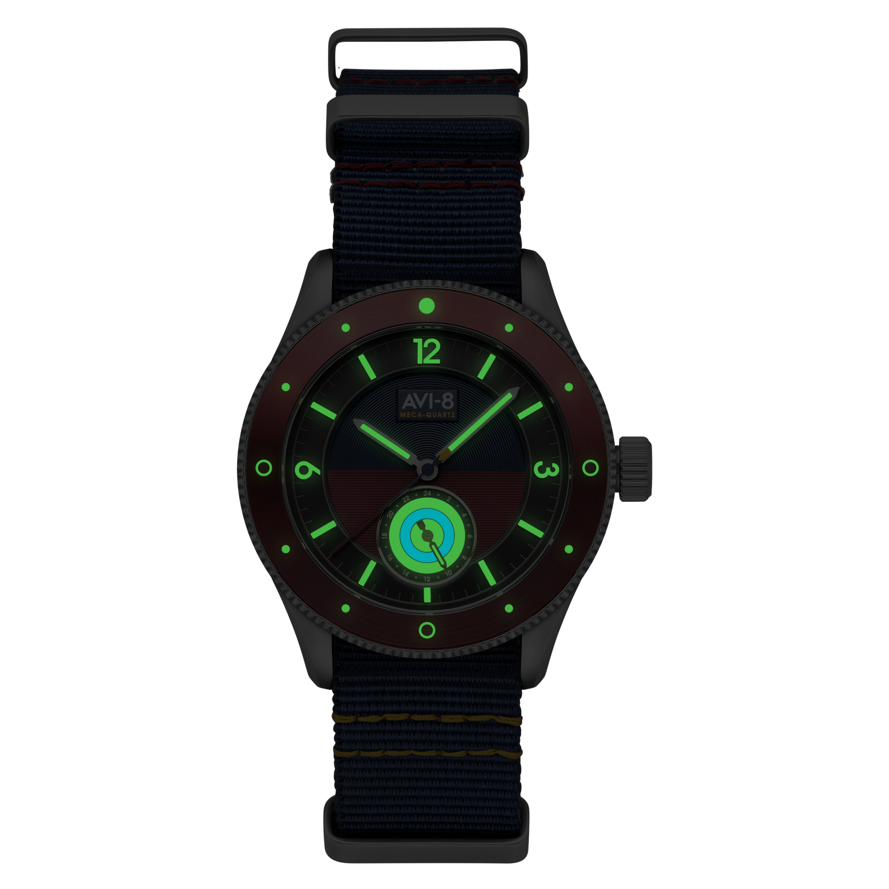 With everyone of my dozen AVI-8 watches, there is a story. This was probably the first one that was not related to a particular plane or pilot or occassion, so it was a 50/50 call with just a tentative link to the pilots who flew in WWI as the ‘hook’. However, I have not been disappointed and it has fast become a favourite. The web strap is very easy to wear (I wish every AVI-8 watch came with a web strap option) and the watch has a great look to it. Combining the red and the blue and then the patterns in the centre dial, means I have a ‘day to day’ watch rather than another one to wear when I’m going out. Great call to buy this and often get the temptation to buy the green version, but holding off for now.