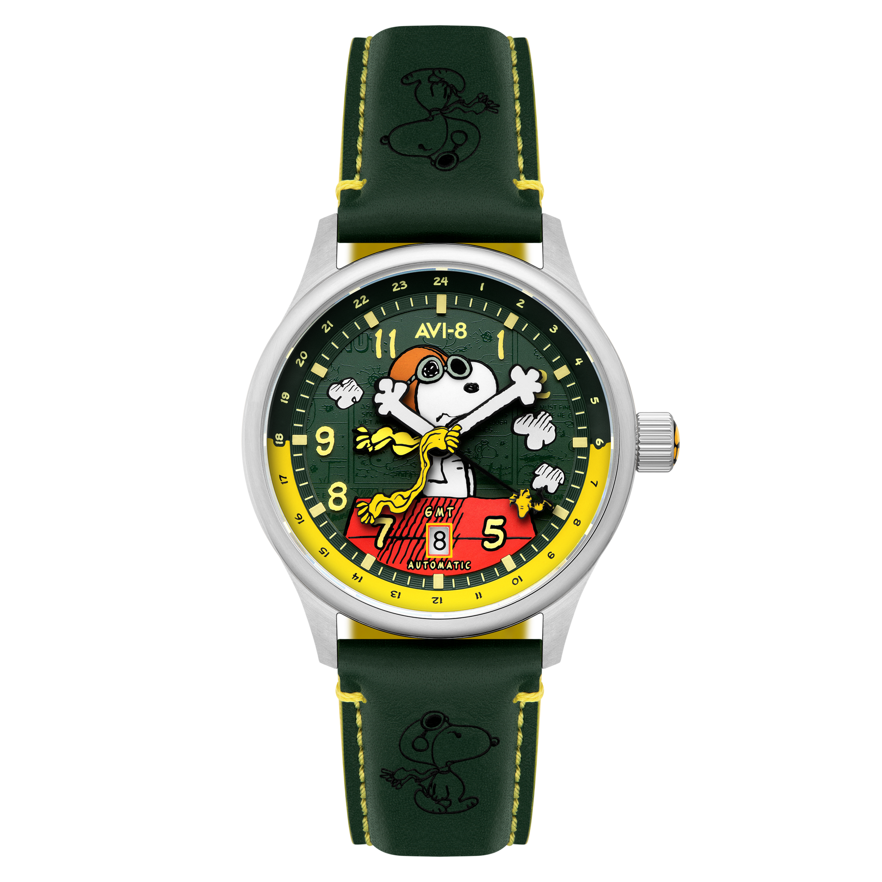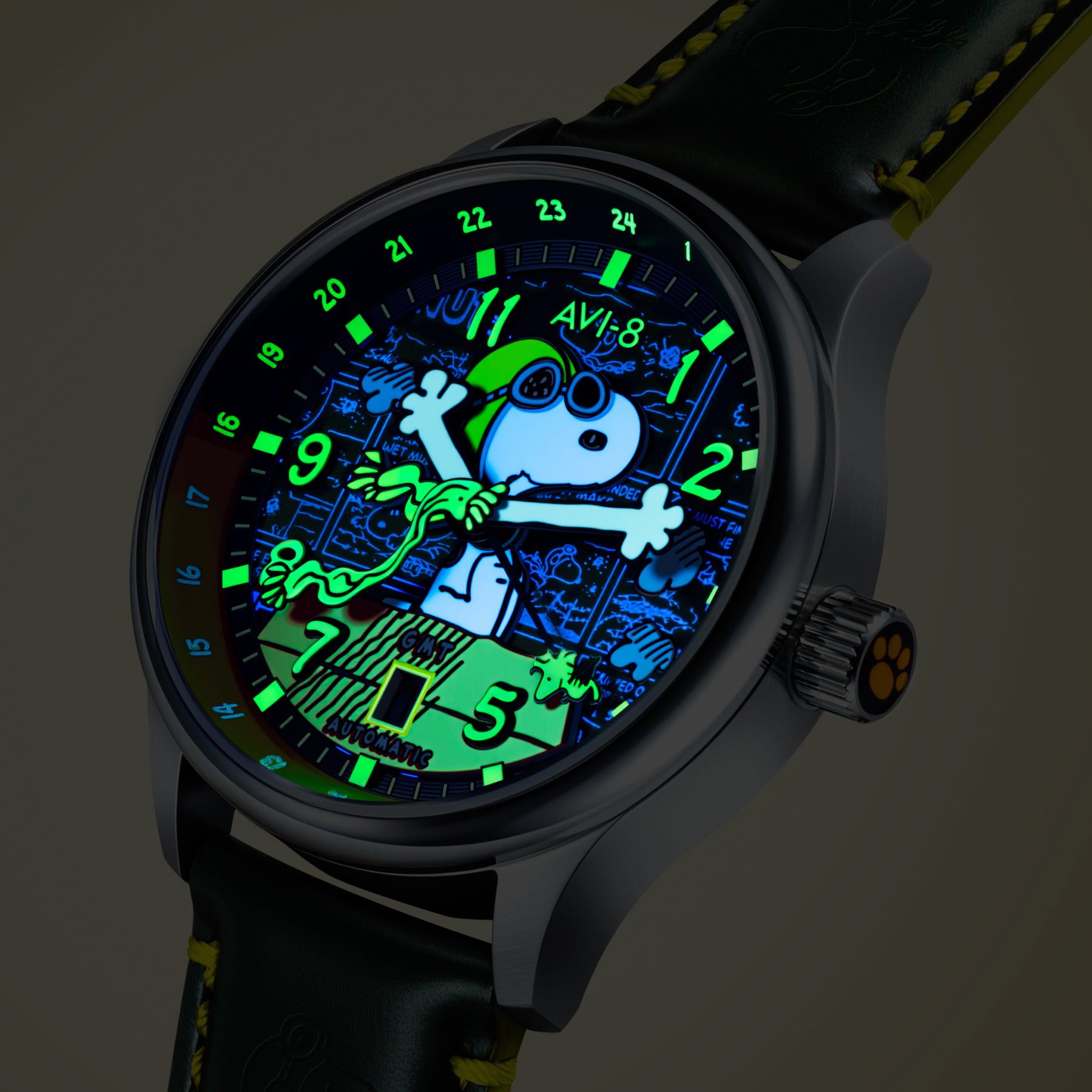 Automatic GMT movement, glowing lume dial, Snoopy paw on the crown, and exhibition caseback. Aviation meets imagination.