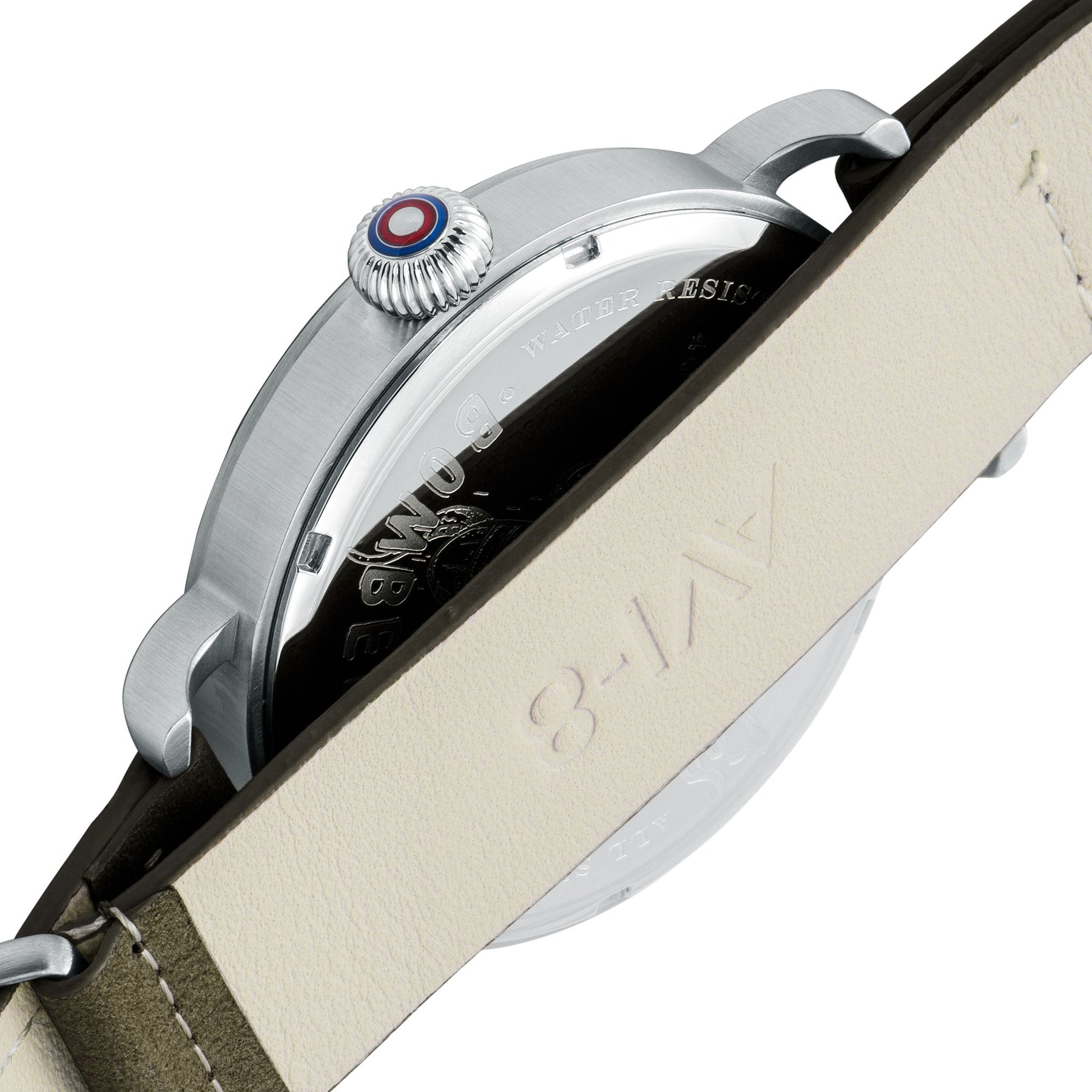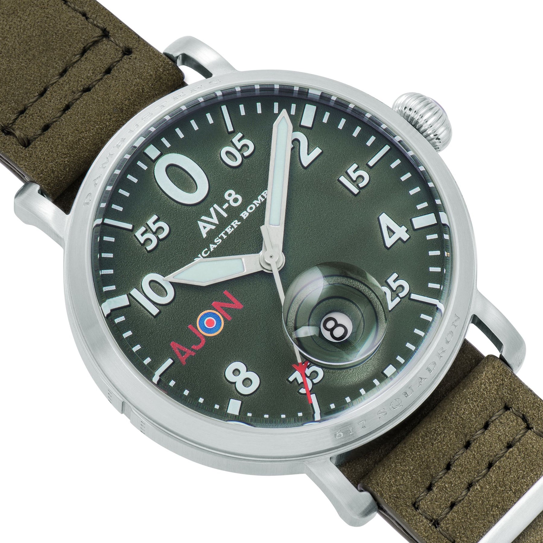This timepiece features a large open case design that offers a clear vintage pilot watch shape replete with bold Arabic numbers on the dial, and gauge-like hands that hint at cockpit displays of the Lancaster. Subtle details such as the squadron reference on the left side of the dial, and the bubble-like date magnifier–sitting at the 6 o’clock position to reference the clear gun turrets on the Lancaster that served as essential defence mechanisms during their strategic bombing missions.